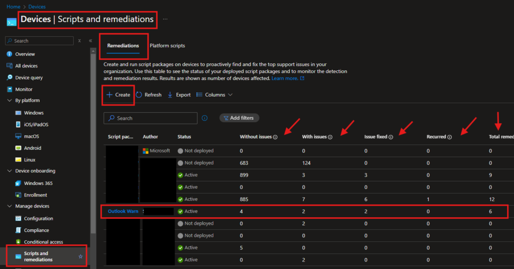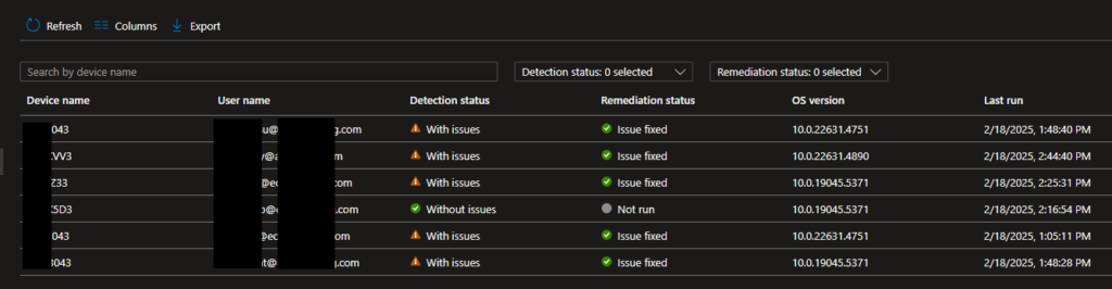 - After deployment, monitor the status by navigating to Devices > Manage devices > Scripts and remediations.